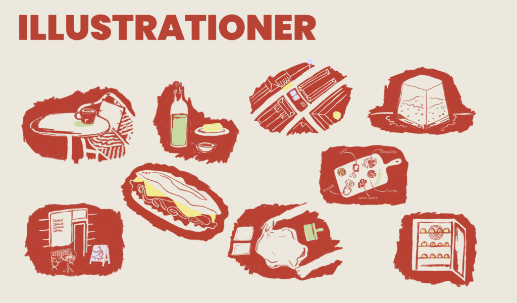 I udviklingen af den visuelle identitet var der stort fokus på at fange personligheden og konceptet bag Søren og Olivias sandwichcafé, Dingse. Illustrationerne, der er skabt i Procreate, afspejler deres humoristiske, kunstneriske og autentiske stil. Denne stil går igen i alt fra deres logo og indretning til deres fokus på det sydeuropæiske køkken. Med illustrationerne har vi forsøgt at indfange netop den stemning.